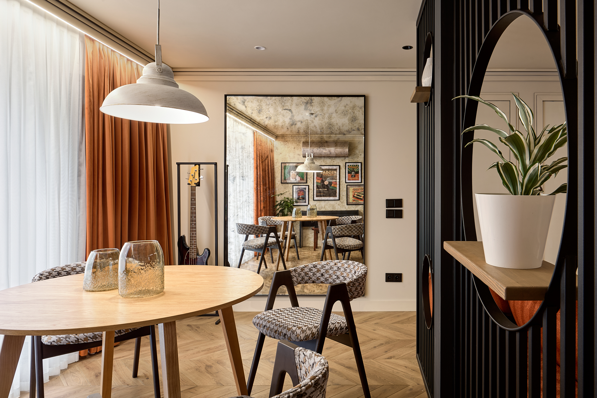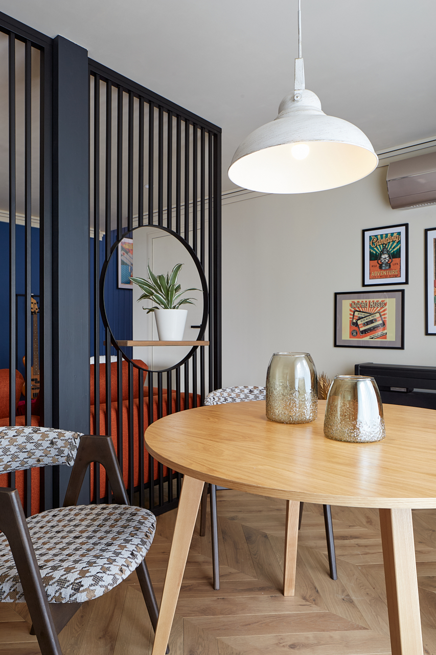 «Пообщавшись с героями, я поняла, что действительно, музыка – это большая часть жизни, поэтому в интерьер я добавила нотные станы, которые буквально пронизали весь интерьер. Нотный стан у нас появится в карнизе, в наличниках и в перегородках, а также в перегородке между столовой зоной и гостиной. Хозяева дома сказали, что очень любят стиль лофт, но я решила, что нужно разбавить этот стиль, отразив его лишь в перегородке, а все остальное замиксовать с мебелью из 60-х. Тем самым мы поддержим любовь наших героев к элементам в стиле ретро и дадим новую жизнь старым предметам.»