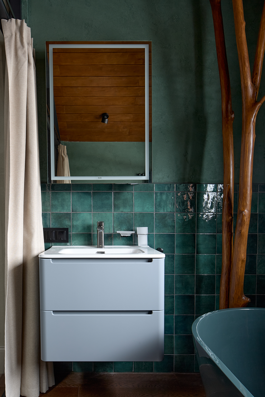 Над ванной разместили люстру Arte lamp GENEVA с тонким черным основанием, прозрачными плафонами в форме цилиндра и шарами из стекла молочно-белого оттенка.