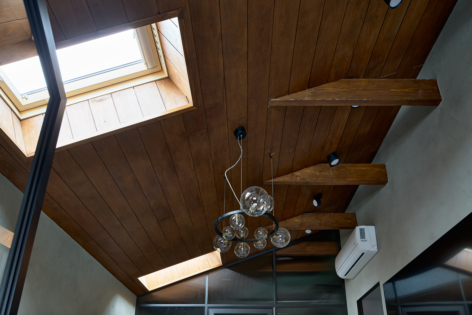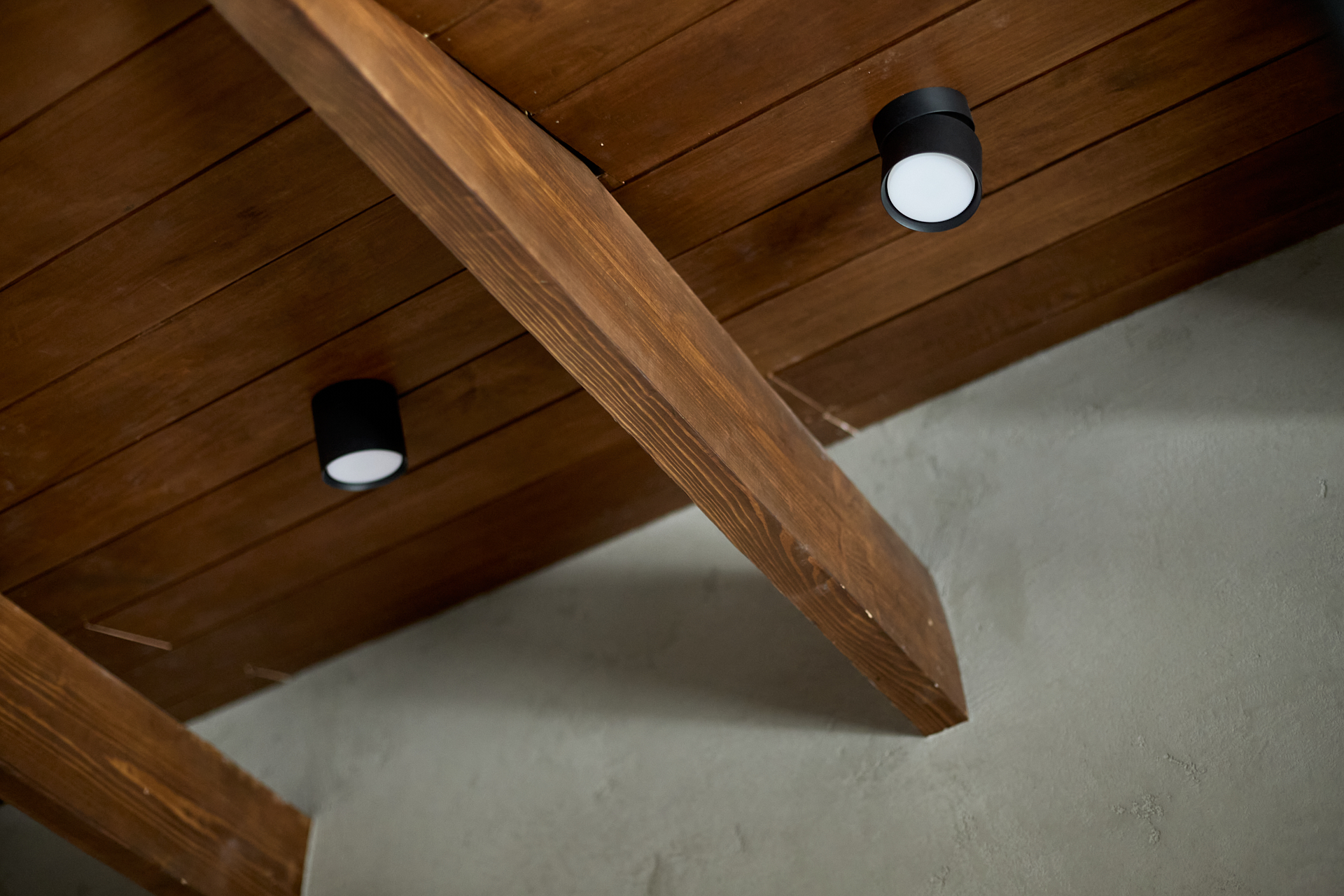Между балками на потолке установили поворотные споты Arte Lamp INTERCRUS, что очень удобно для помещений со сложной геометрией.