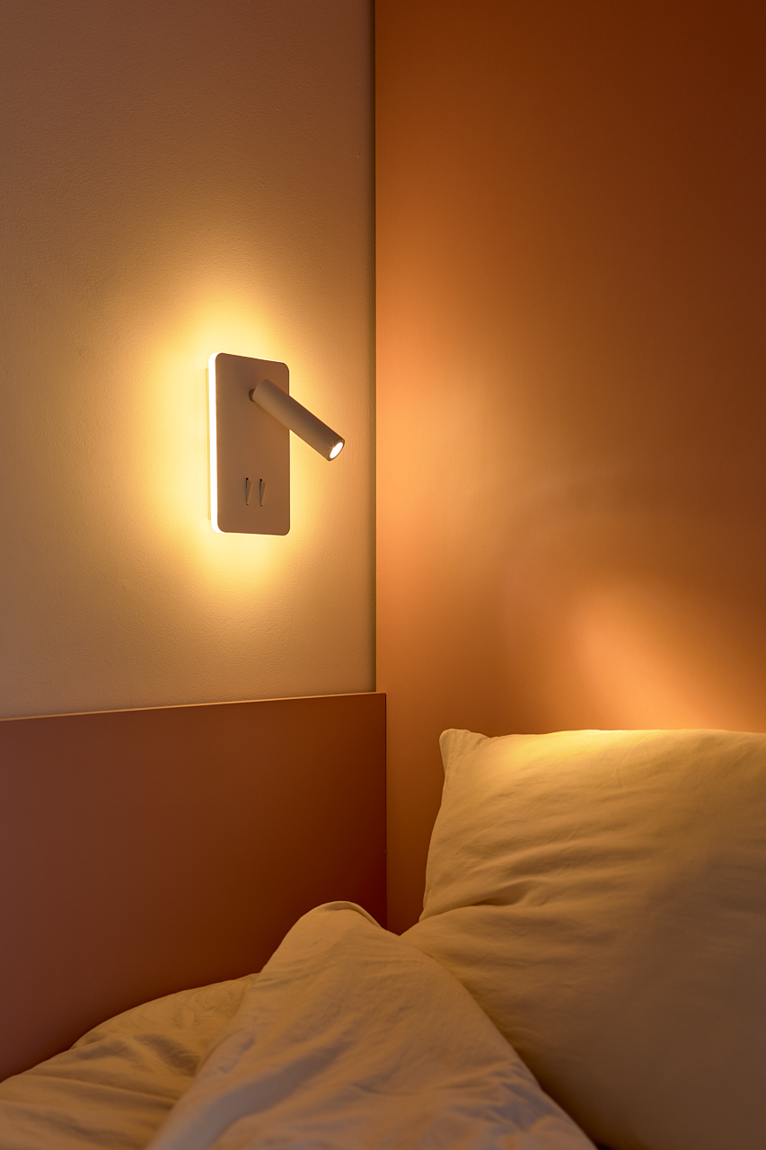 Для освещения над кроватями выбрали функциональный настенный светильник Arte Lamp ELECTRA A8233AP-1WH с двумя источниками света. Корпус с LED подсветкой по периметру создает парящий эффект. Спот с поворотным механизмом вращается в разные стороны. Кнопки на корпусе позволяют управлять источниками света по отдельности.