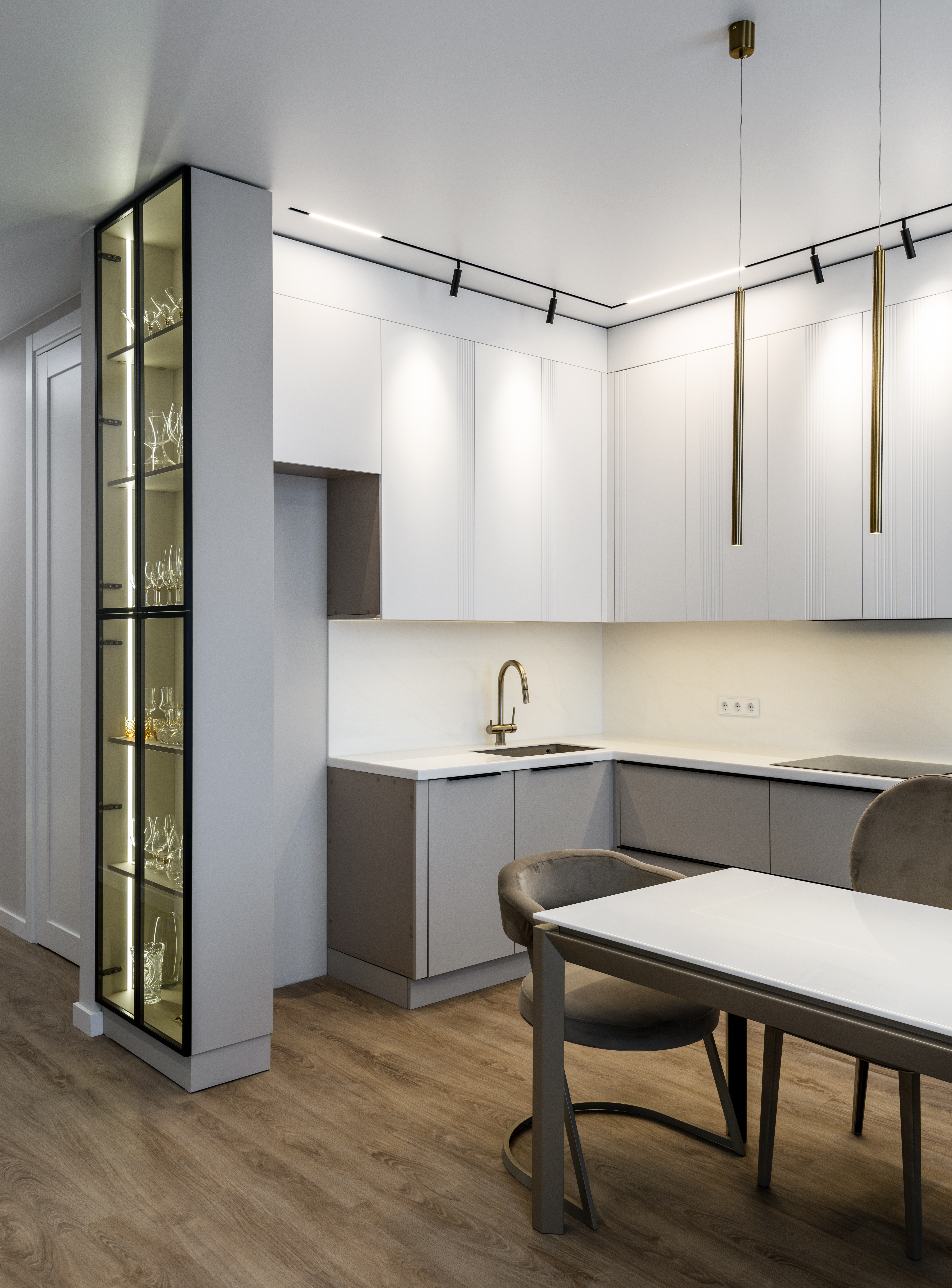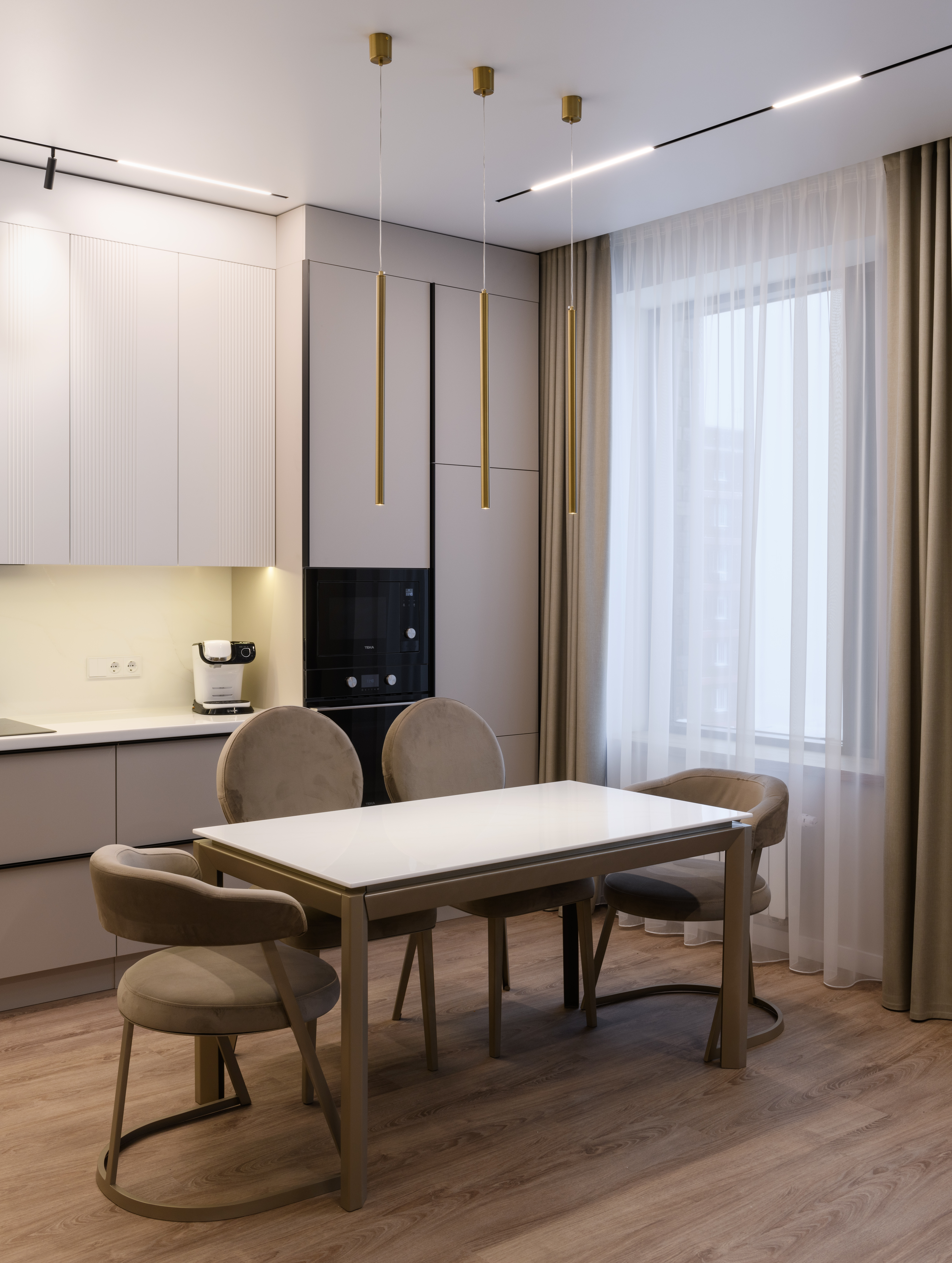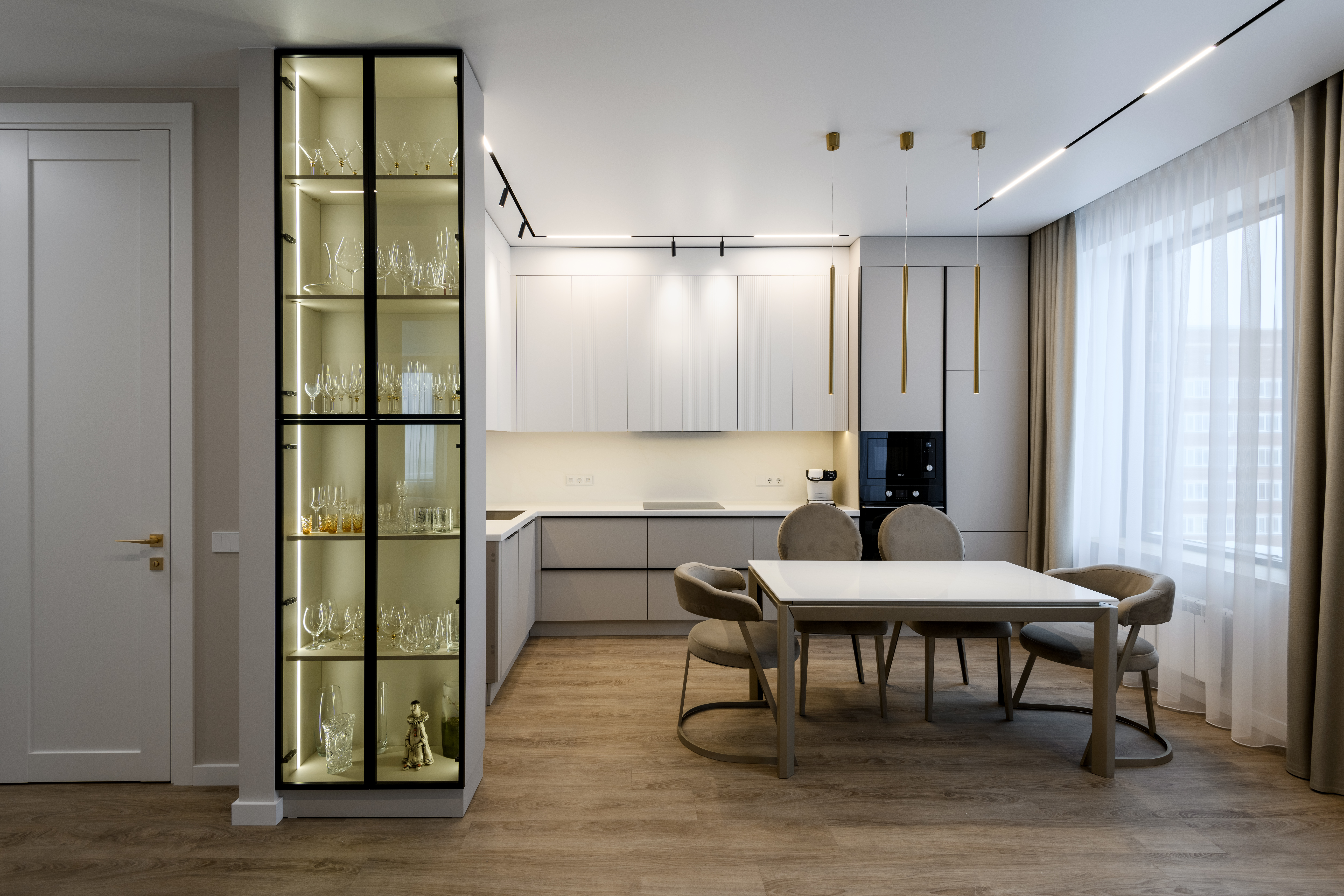 Интерьер в современном стиле с классическими элементами. Дизайнер Надежда Дель предусмотрела несколько сценариев освещения. Основной свет — это трековая система Arte Lamp с линейными светильниками. Они создают мягкое рассеянное освещение с широким углом. Для акцентов использовали различные декоративные подвесные светильники.