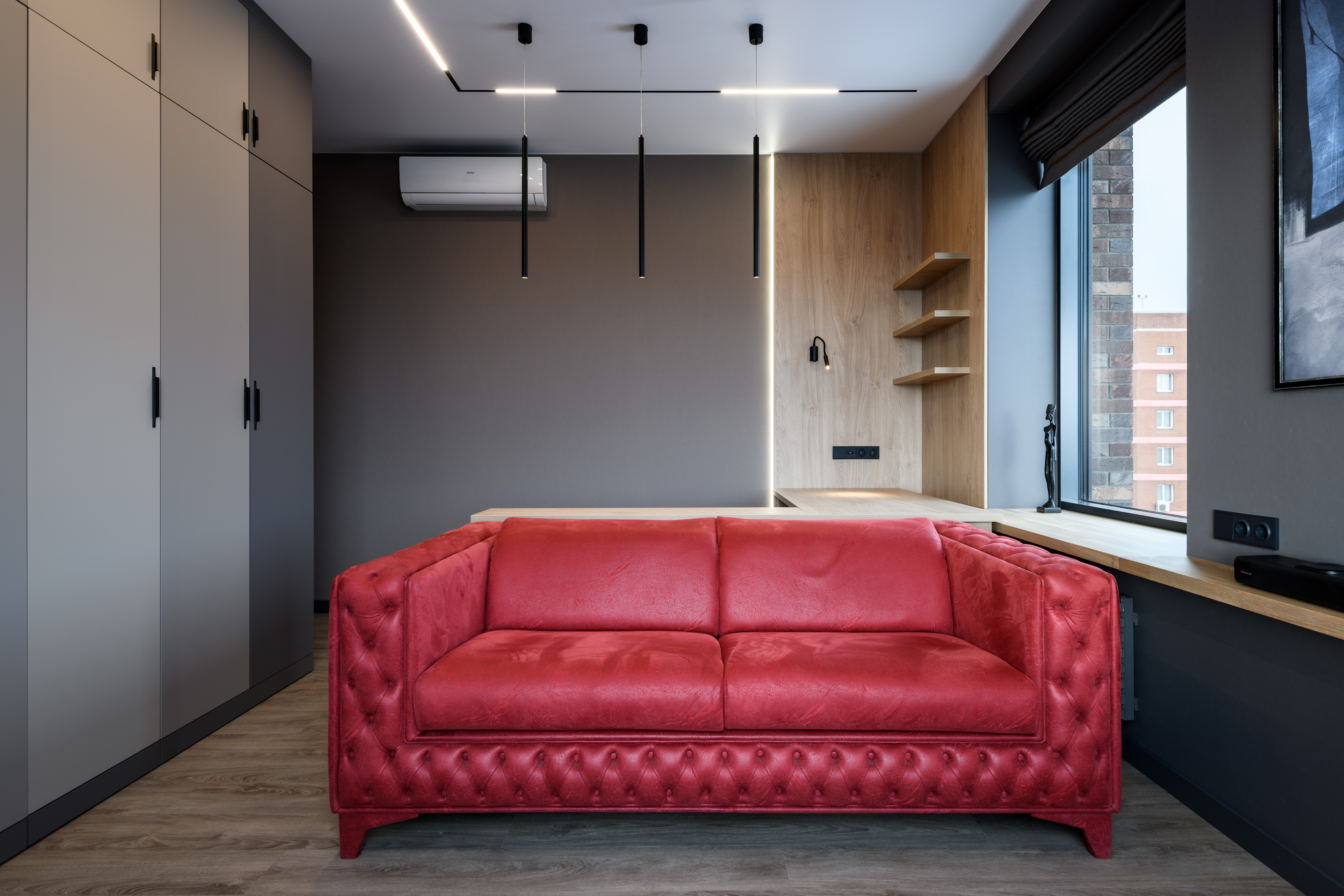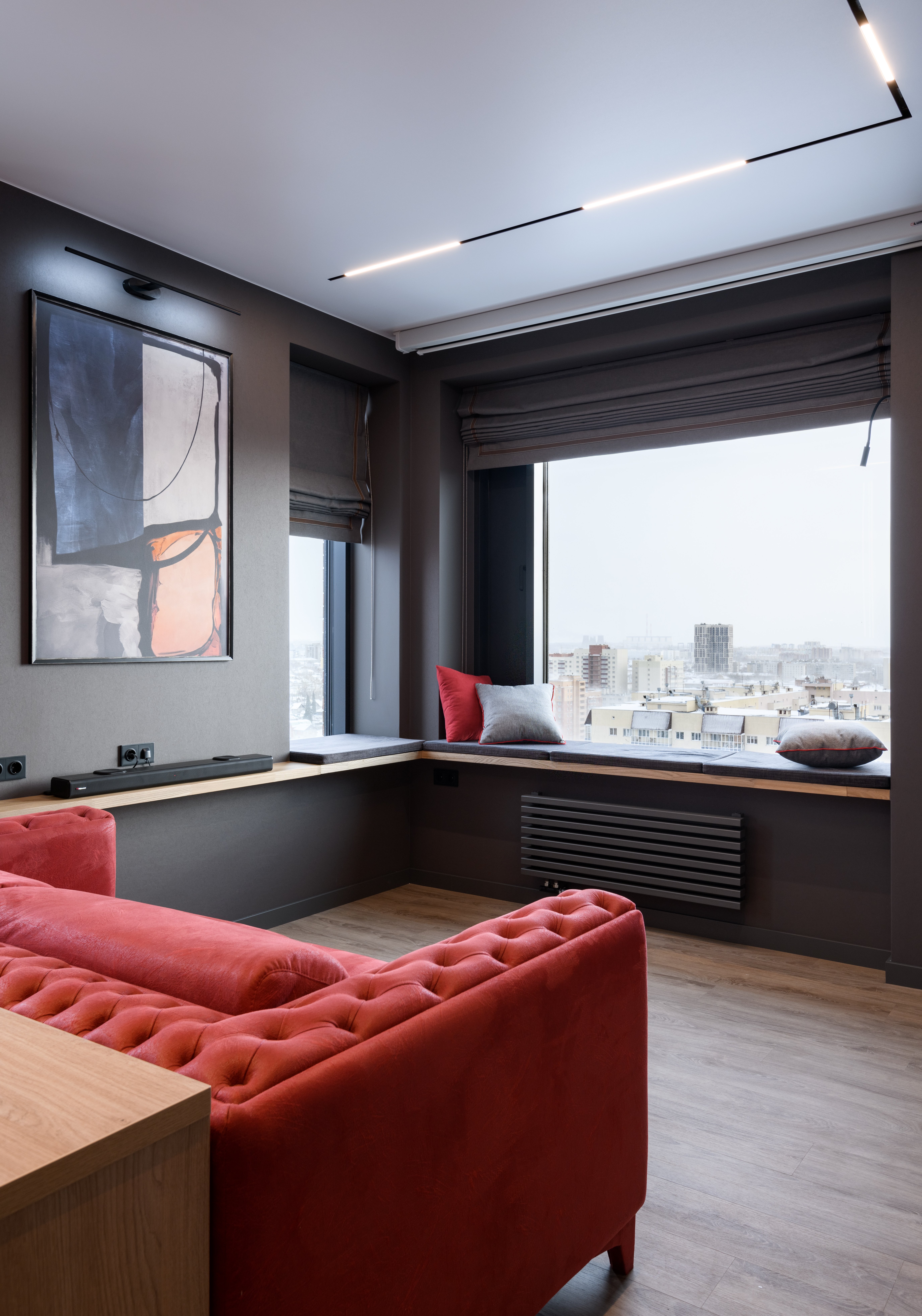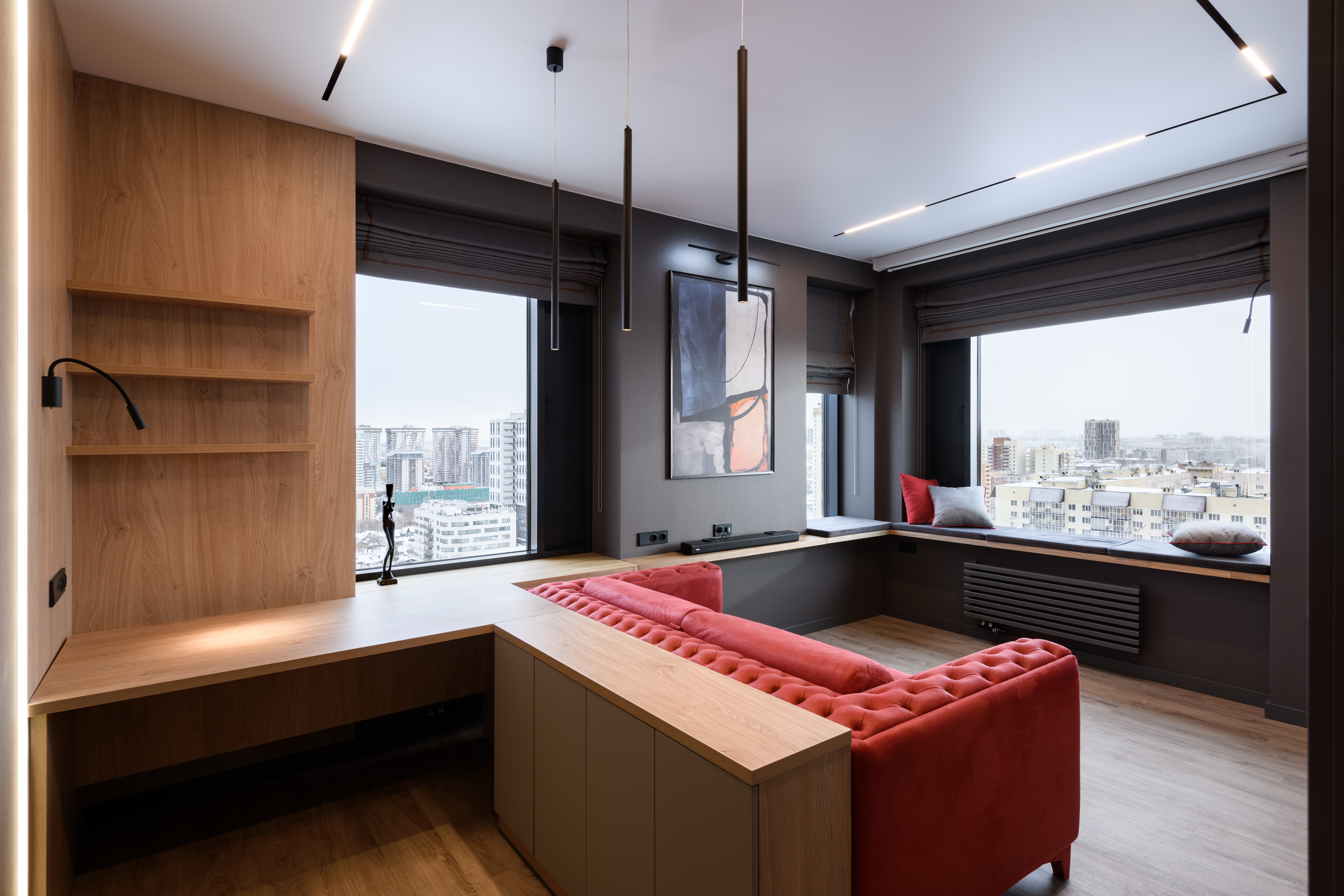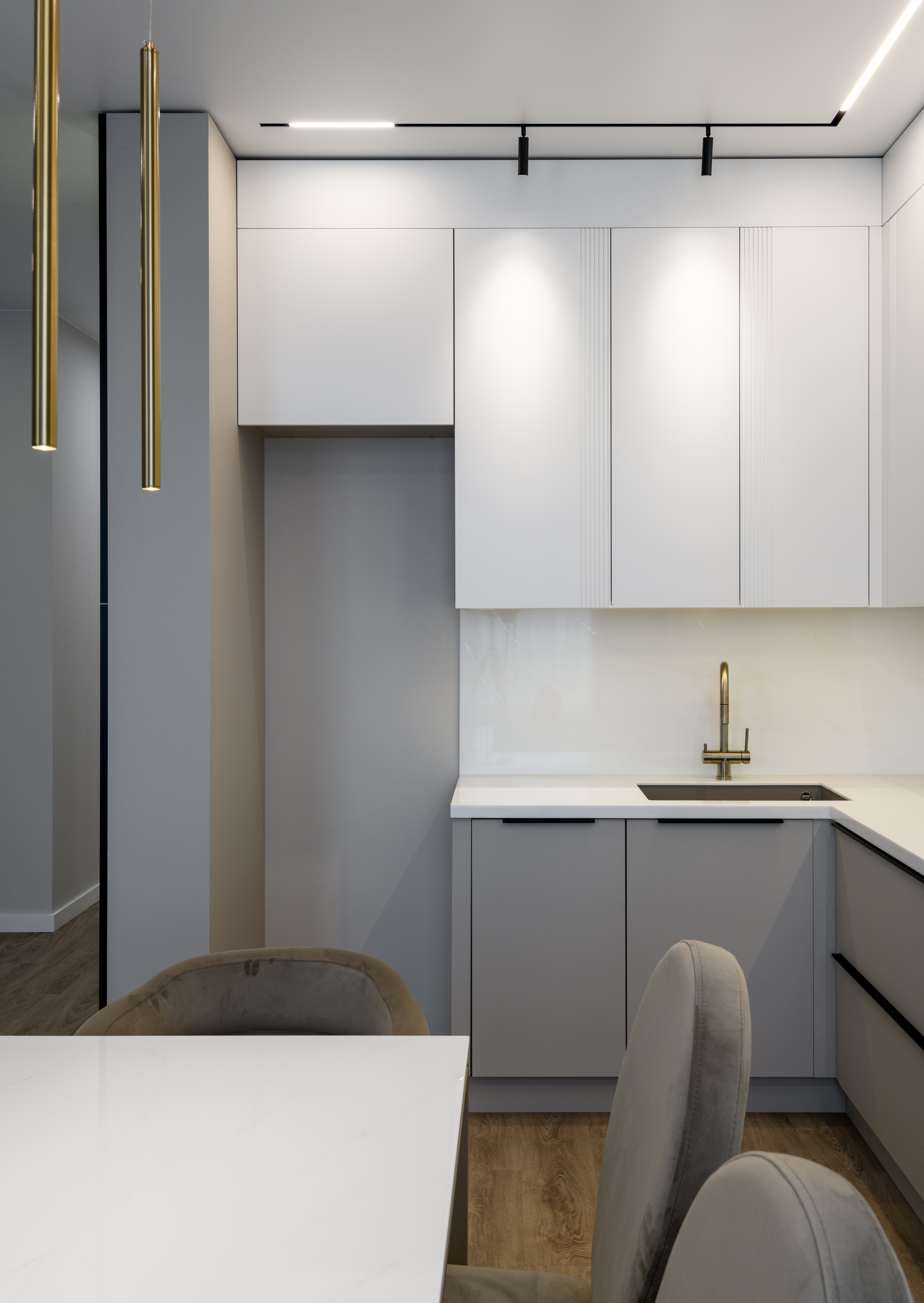 Интерьер в современном стиле с классическими элементами. Дизайнер Надежда Дель предусмотрела несколько сценариев освещения. Основной свет — это трековая система Arte Lamp с линейными светильниками. Они создают мягкое рассеянное освещение с широким углом. Для акцентов использовали различные декоративные подвесные светильники.