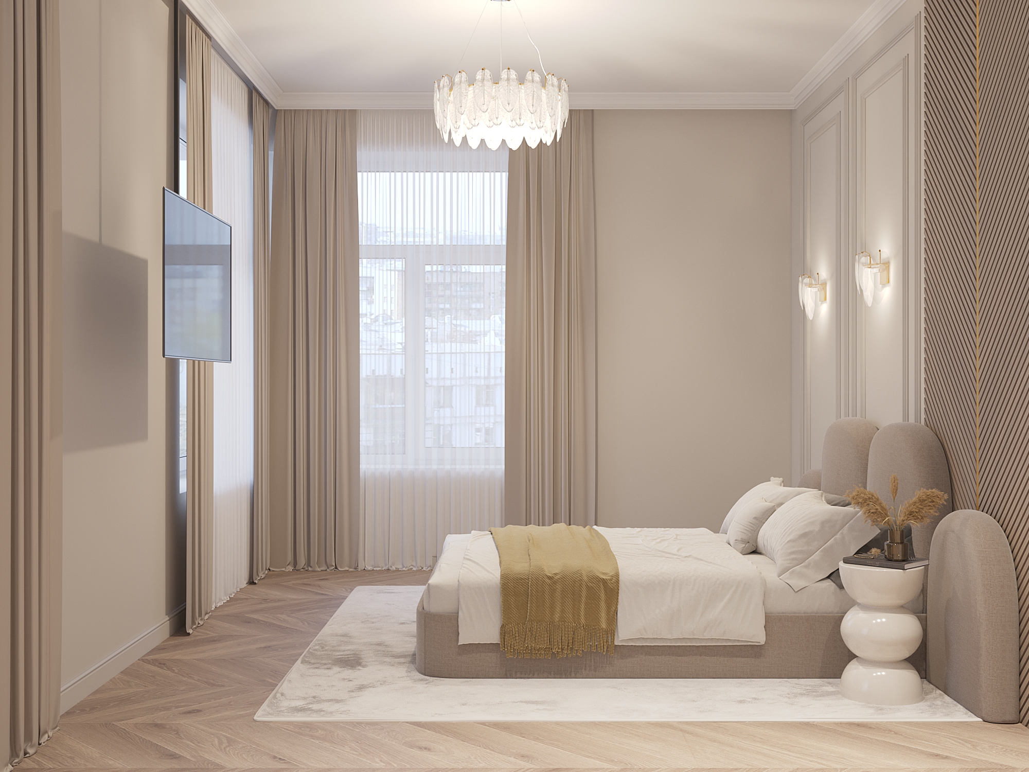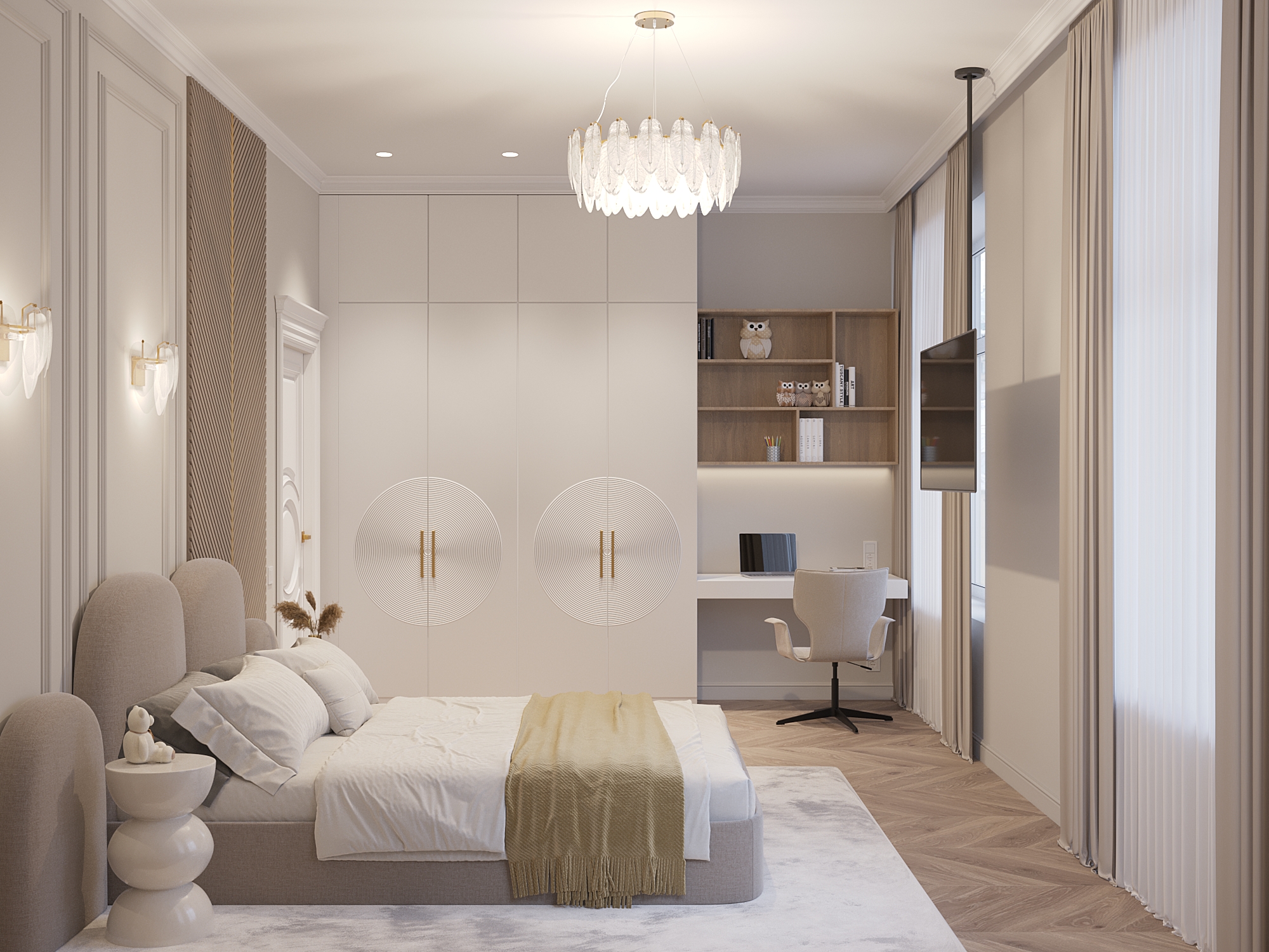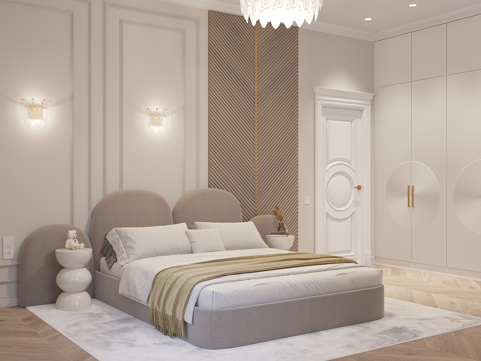 «Эта квартира в неоклассическом стиле сочетает в себе элегантность, комфорт и функциональность. Светлые оттенки, изысканные материалы и продуманные решения создают атмосферу уюта и роскоши. Основной задачей была сделать просторную кухню-гостиную, большую мастер-спальню с гардеробной и санузлом, детскую, комнату для гостей и прачечную».