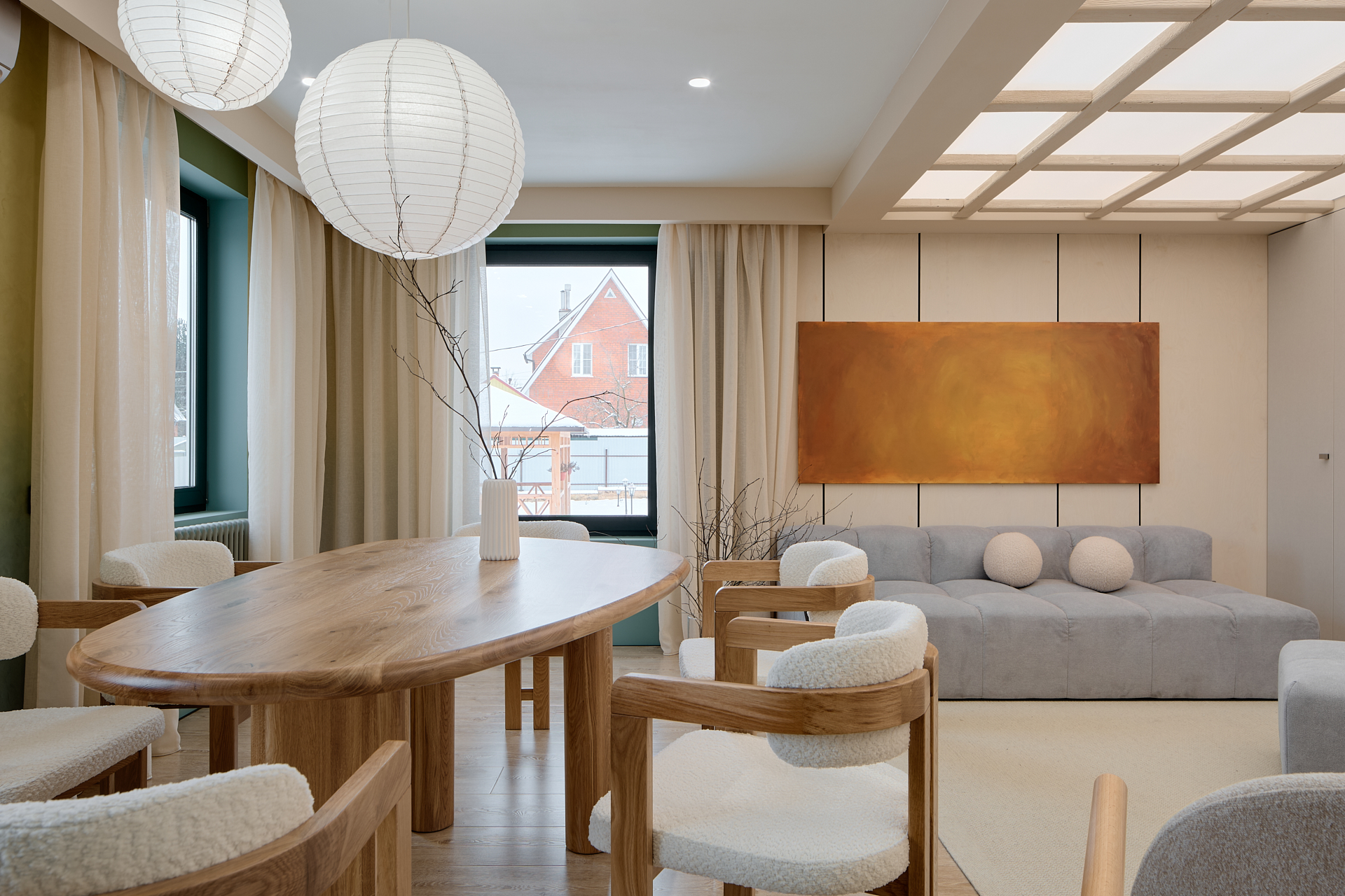 Здесь отсылкой к Японии для меня служит само помещение с очень низкими потолками. Плюс само расположение дома за чертой города в единении с природой говорит о том, что здесь нужно применять натуральные материалы, которые так же красиво проживают свою жизнь, как и сам дом».