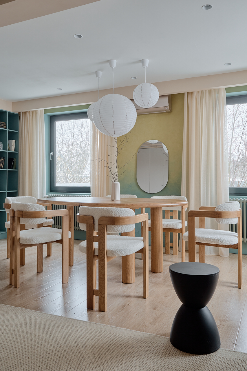 В качестве основного освещения в обеденной зоне использовали точечные встраиваемые светильники KANG. Они белого цвета, утоплены в потолок и практически не заметны. Поворотный механизм позволяет направить свет под нужным углом, а антислепящий фильтр обеспечивает высокий комфорт для глаз.
