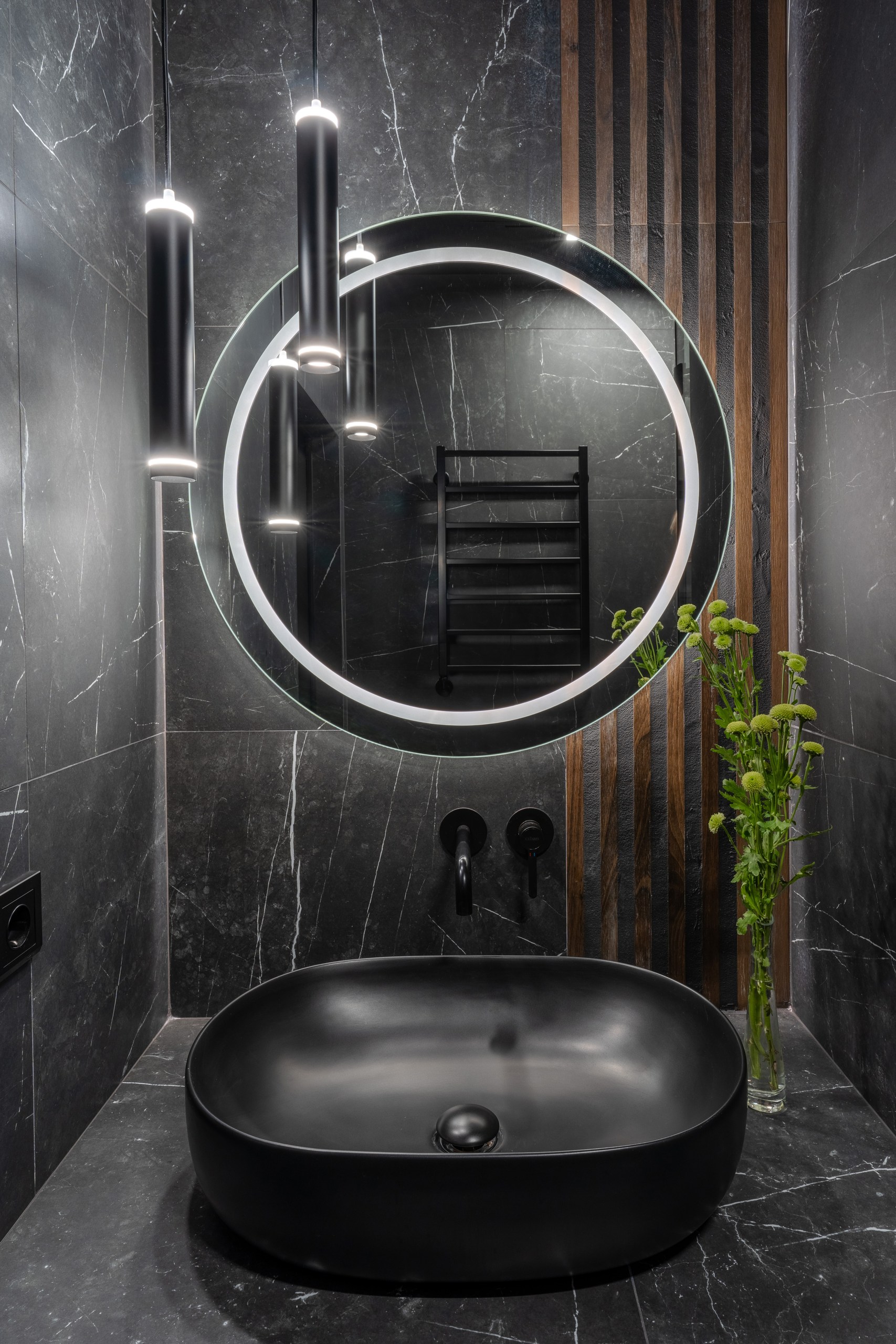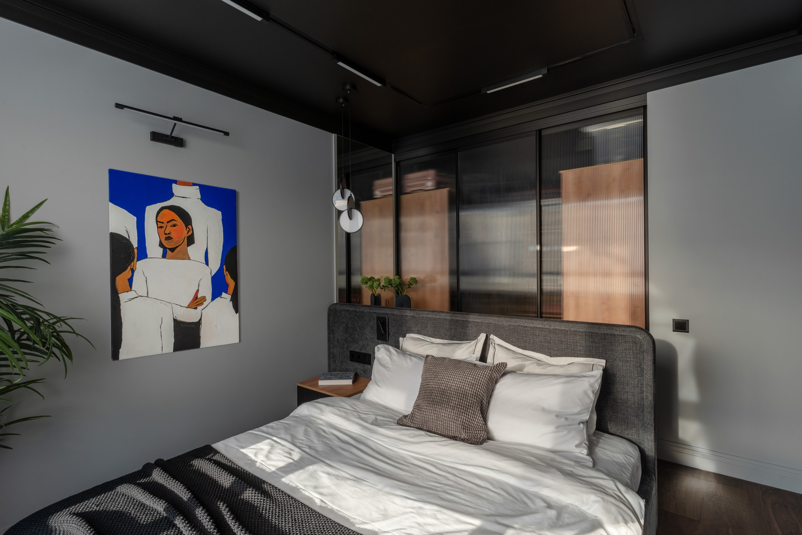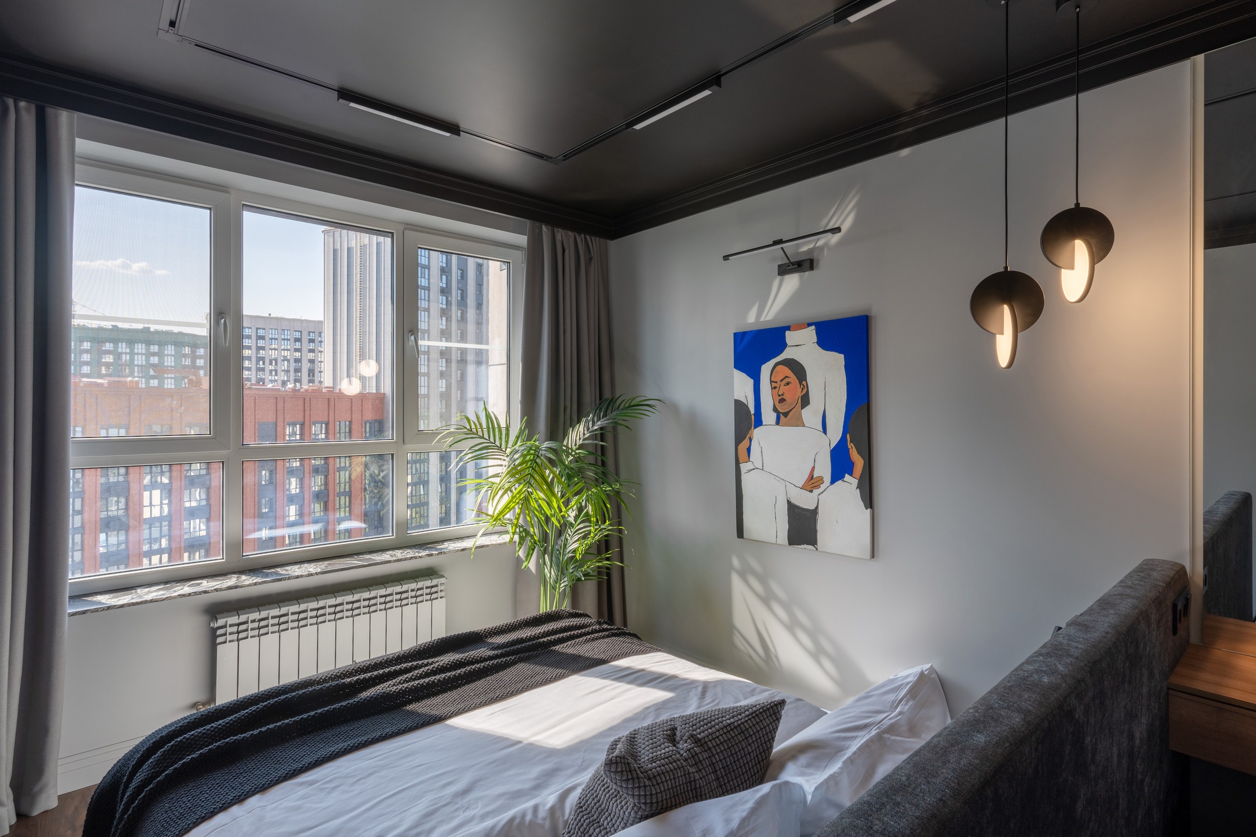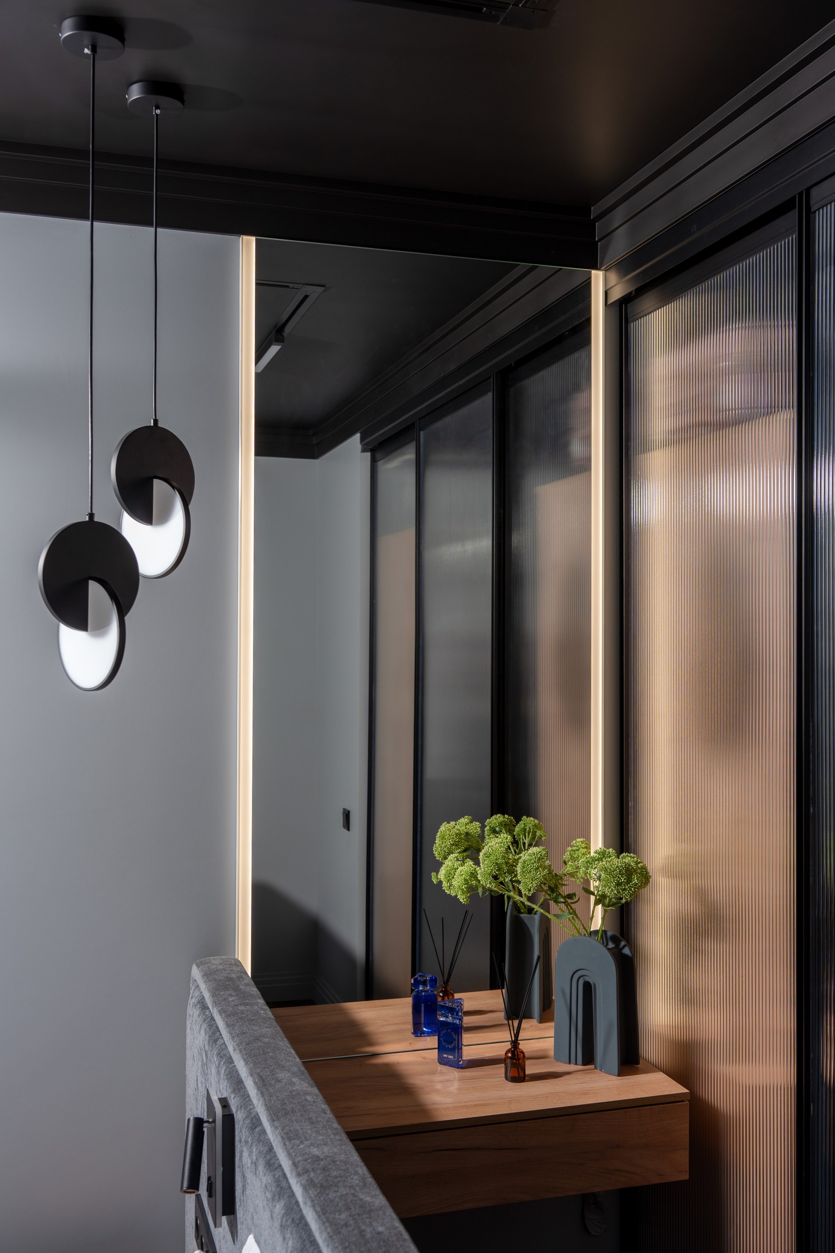 В спальне замечательно занял свое место перед входом в гардеробную будуарный столик. А еще очень классное расположение кровати с видом в окно. В последнее время заказчики все чаще отказываются от телевизора в спальне. В кухне-гостиной наша любимая композиция - «стол у окна» с красивой люстрой над ним. Заказчица с самого начала создания проекта твердо знала, чего она хочет в отделке. Черный потолок был одним из пунктов. И, несмотря на стандартную высоту потолка, он не «давит» а даже наоборот, придает некоторое ощущение камерности”.