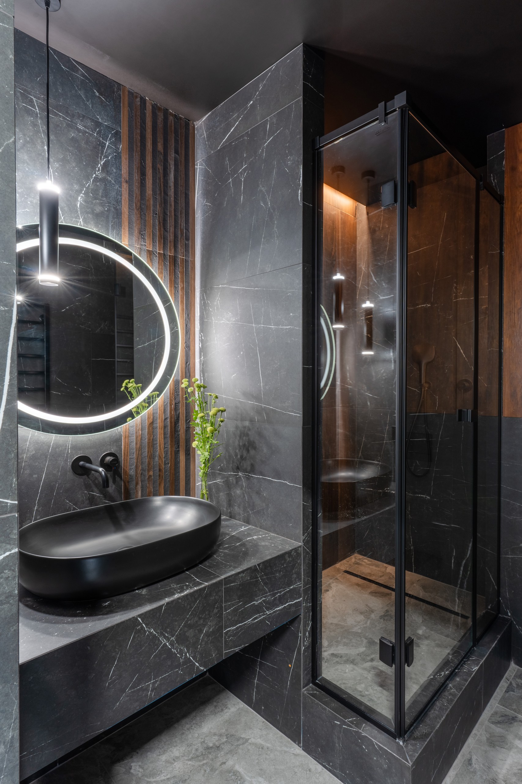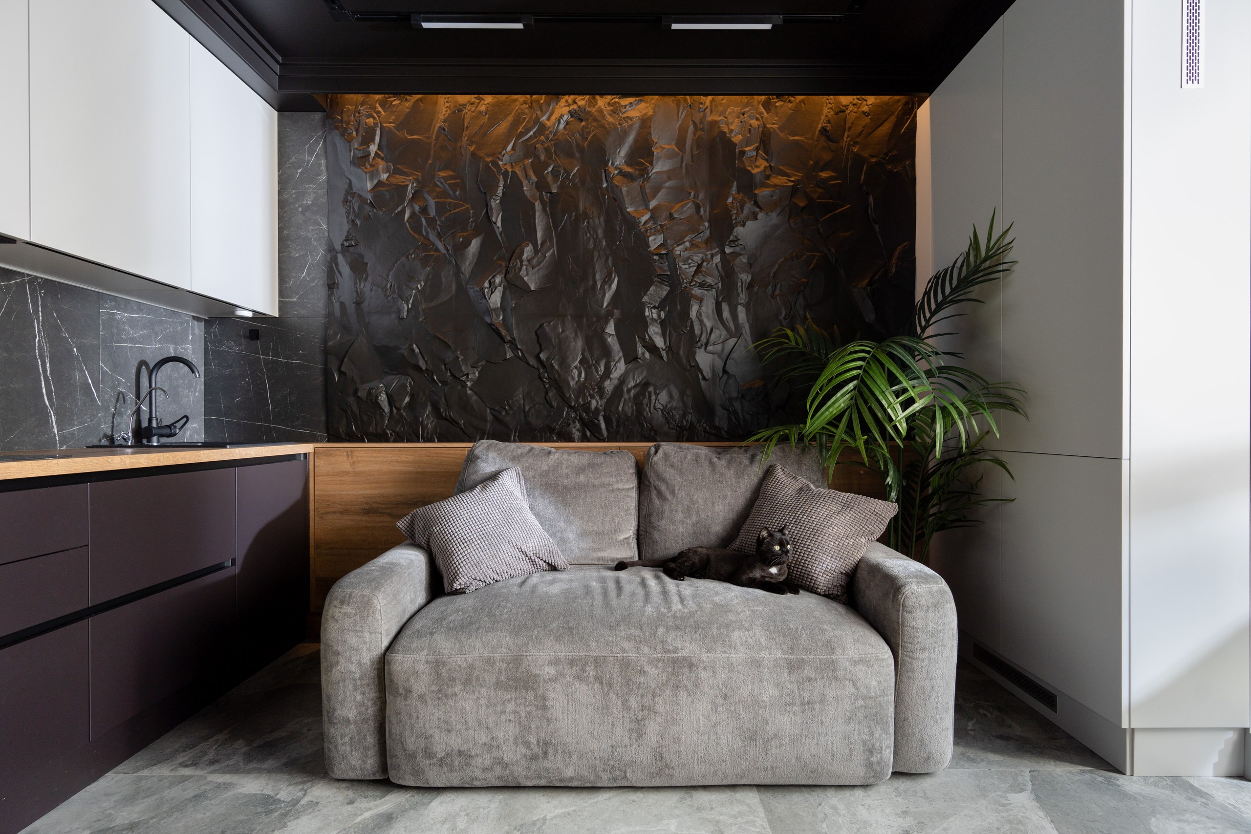 “Квартира создавалась для молодой девушки, и задача была организовать максимально функциональное пространство для жизни. В 46 метрах нам удалось разместить: кухню-гостиную, спальню, достаточно комфортную для такой площади гардеробную, санузел и даже постирочную. Там расположились стиральная и сушильная машины, гладильная доска, бытовая мойка и все необходимые для поддержания чистоты в квартире атрибуты.