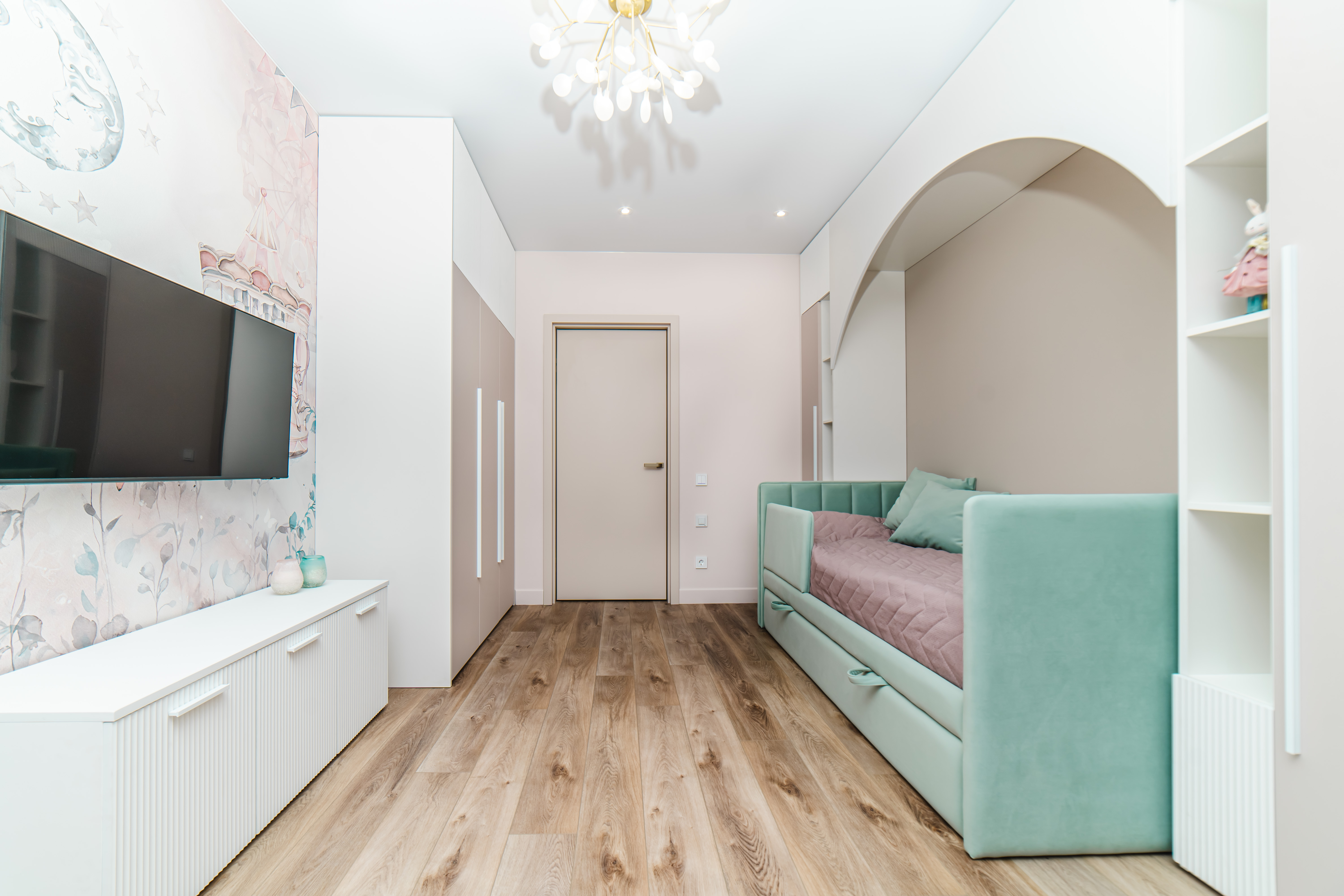 При планировке особое внимание уделялось созданию функционального пространства с гардеробными и хозяйственными комнатами, а также эффективному использованию лоджий с панорамными окнами. На одной лоджии оборудовано рабочее место для ребёнка, а на другой — зона отдыха для родителей.