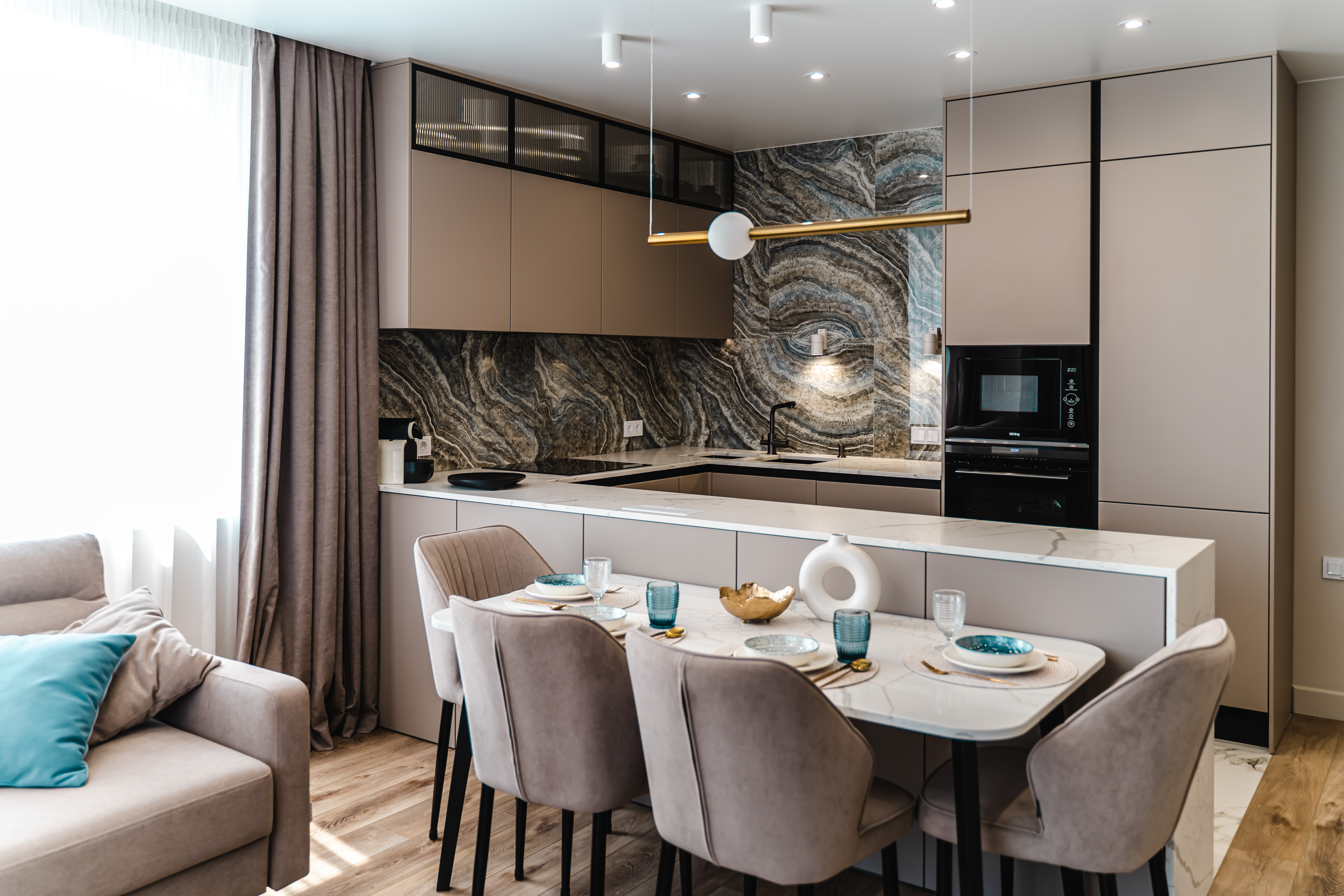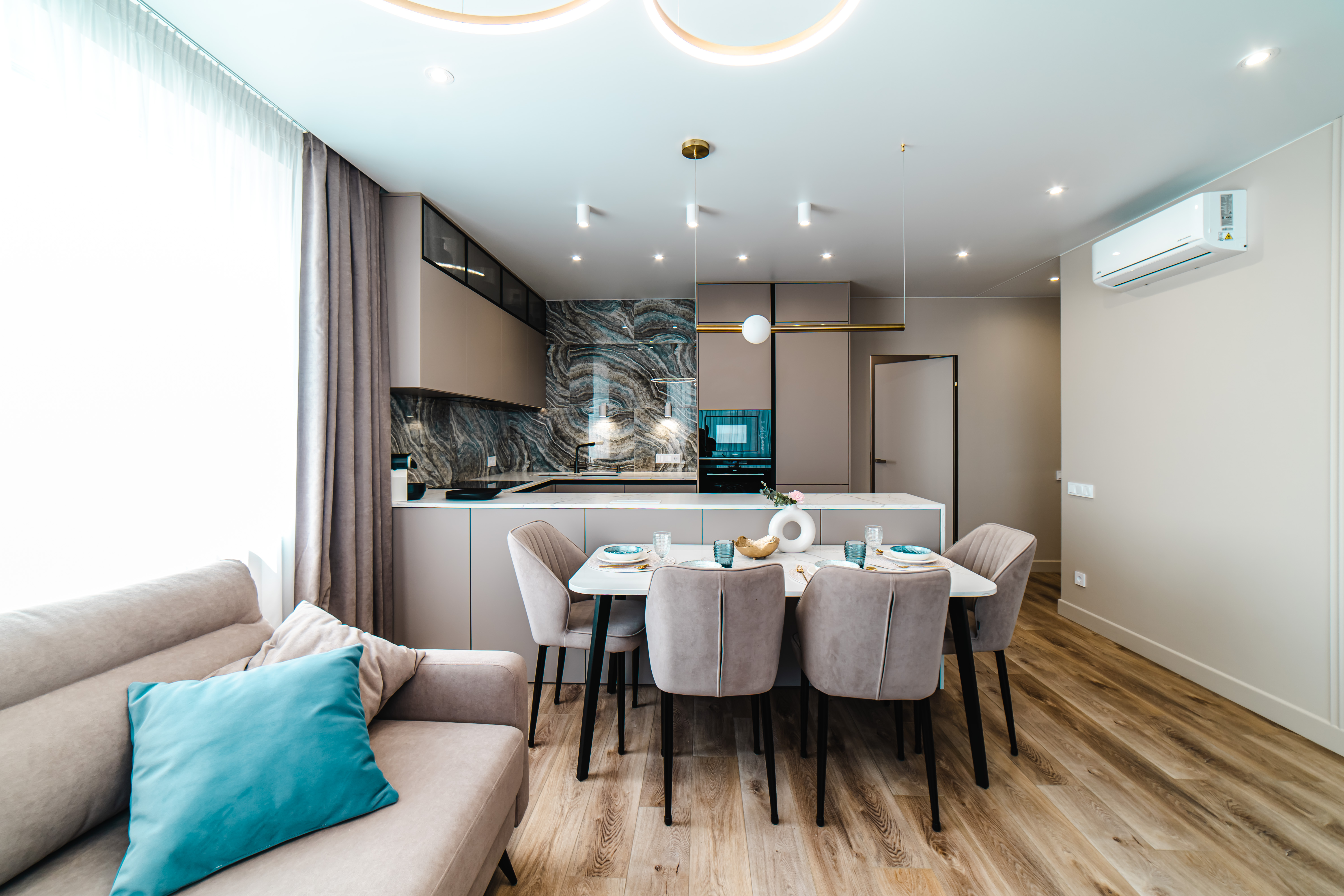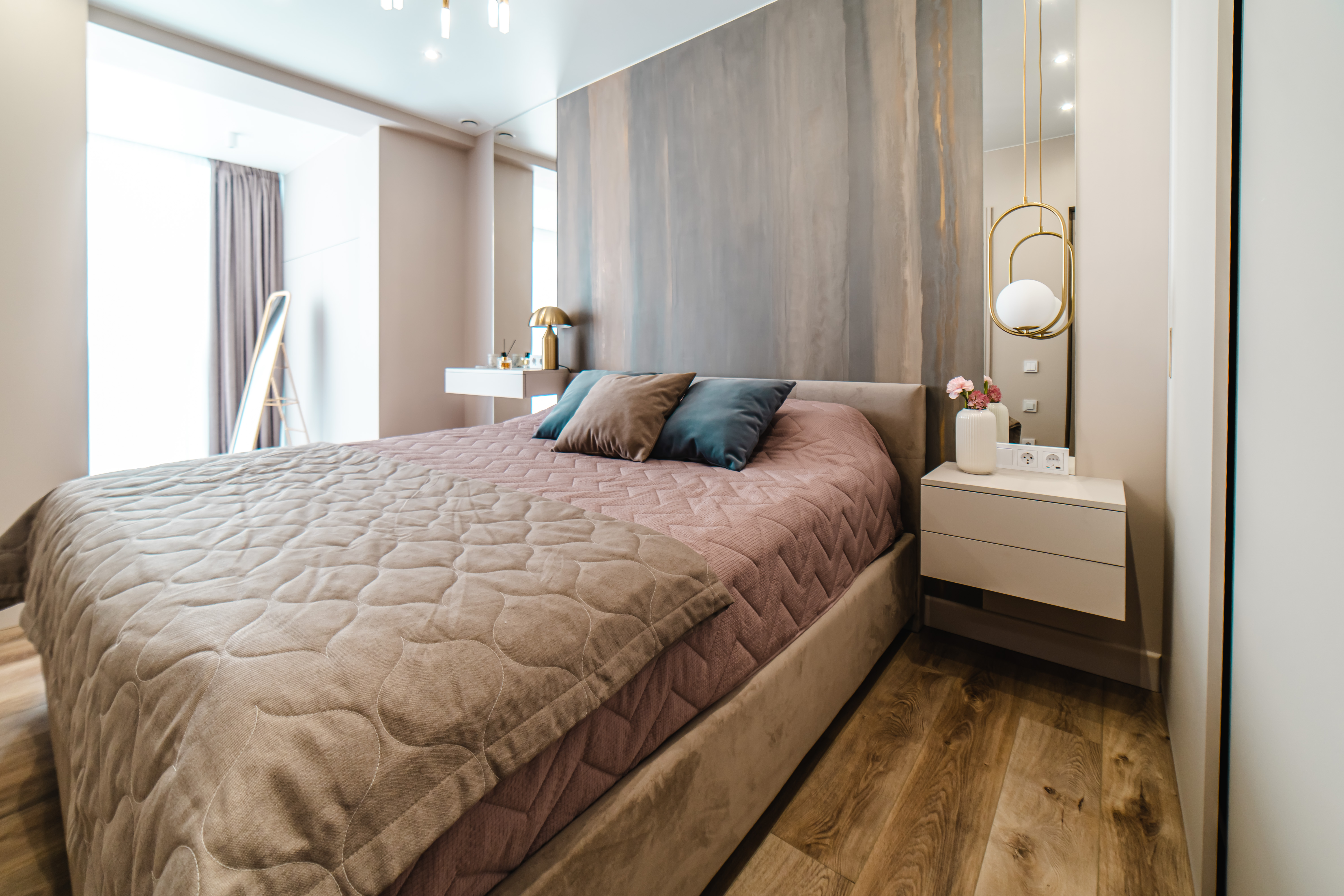 Интерьер выполнен в современном стиле минимализма с приятными тёплыми оттенками.
