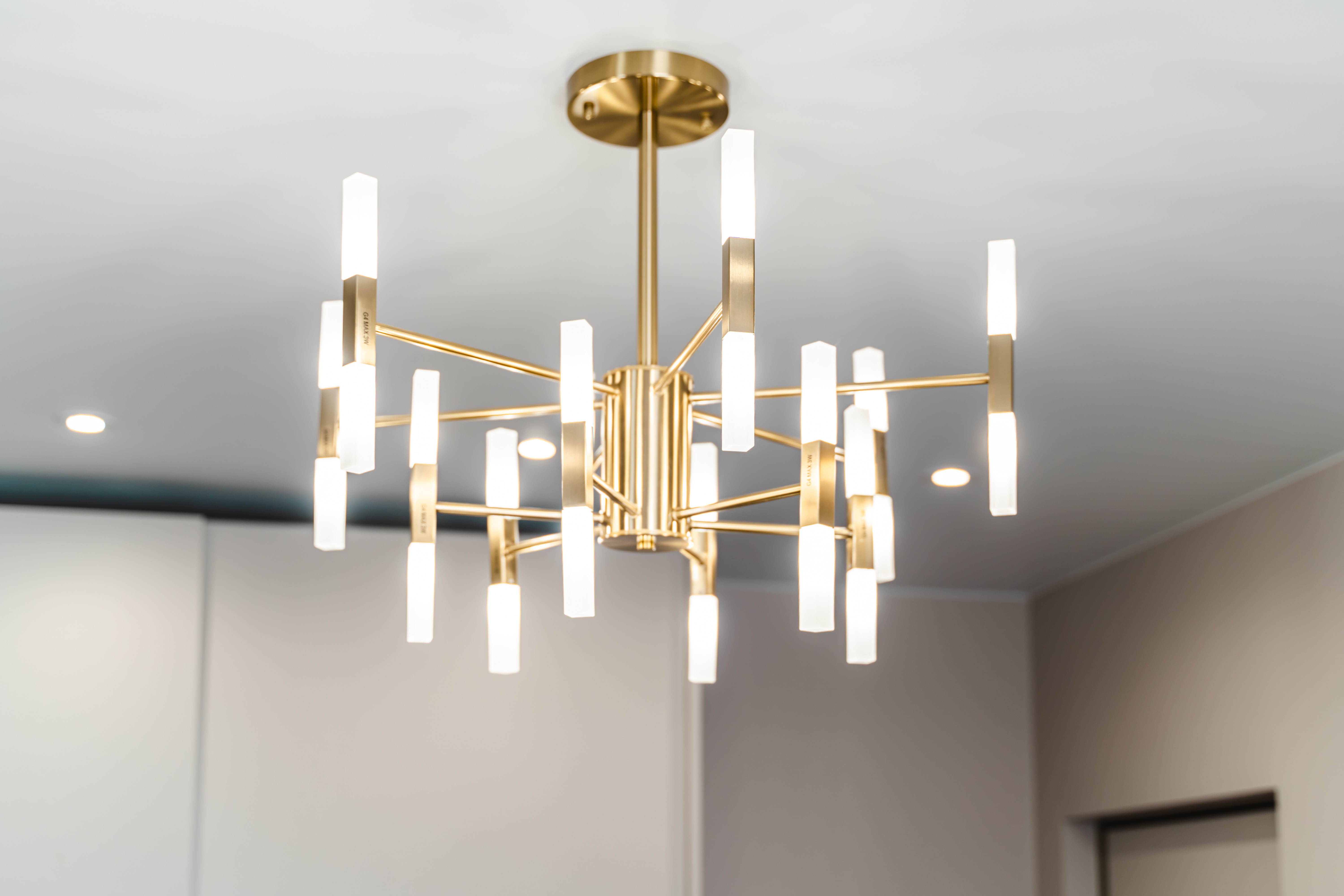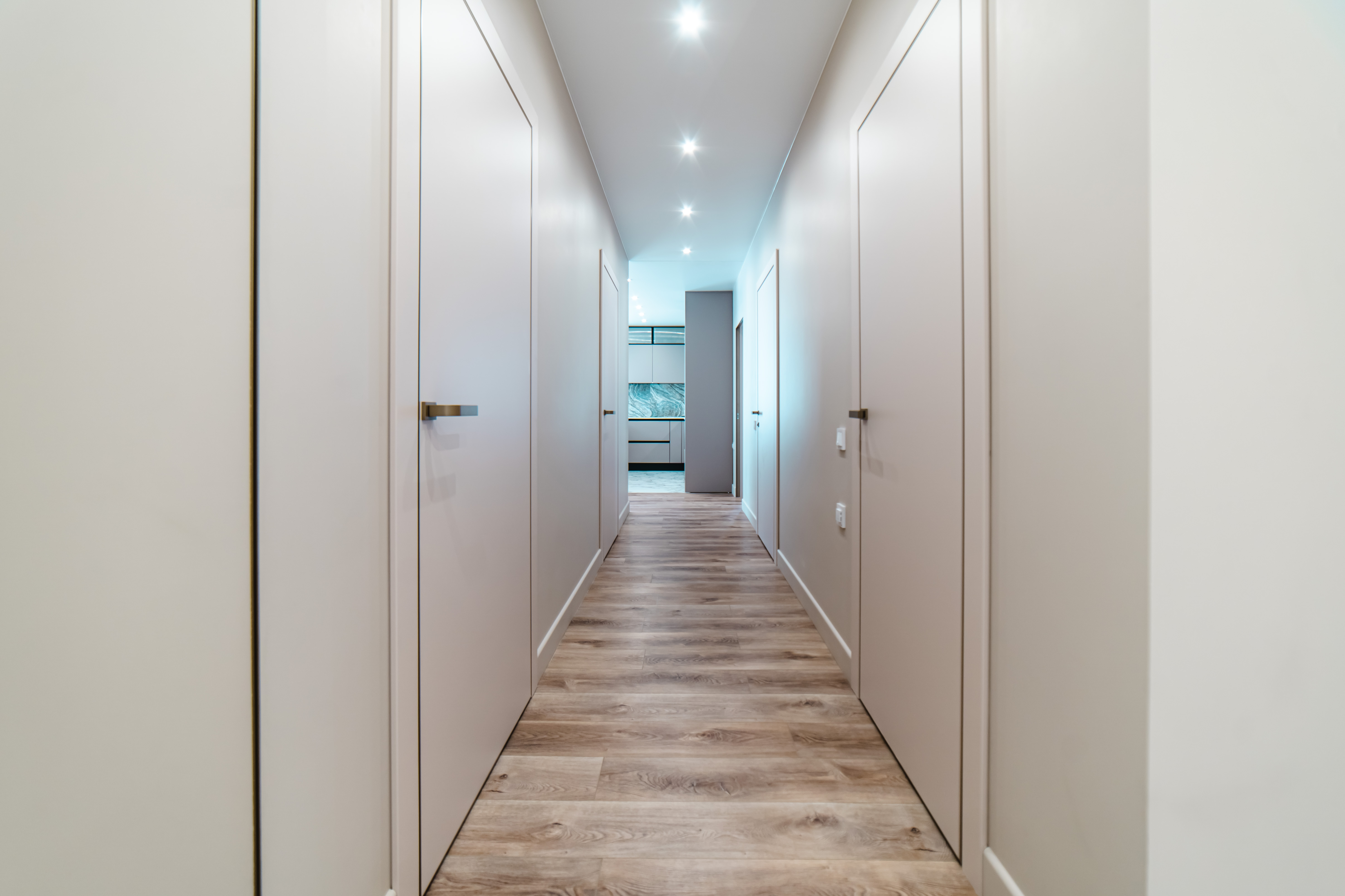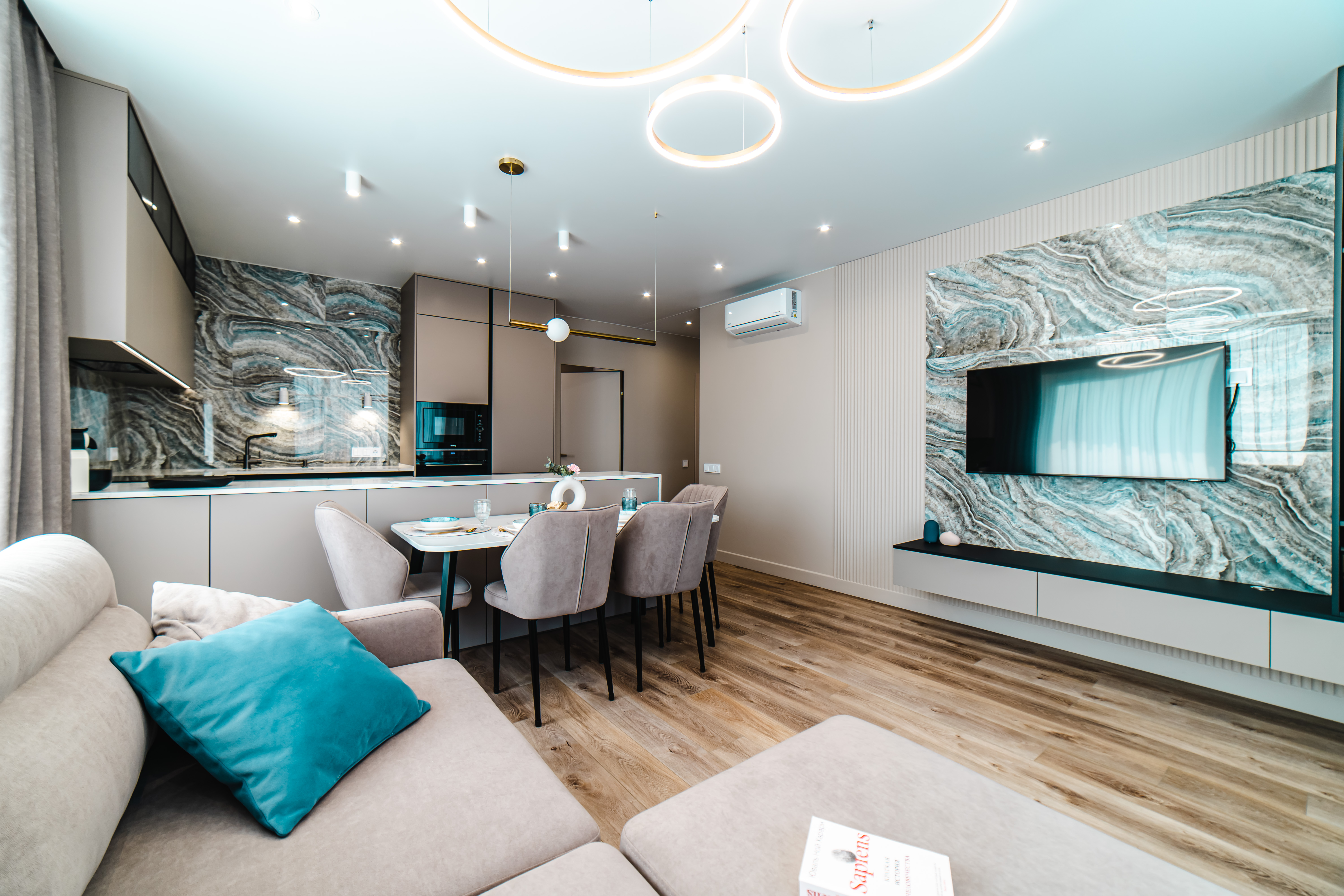 Интерьер выполнен в современном стиле минимализма с приятными тёплыми оттенками.